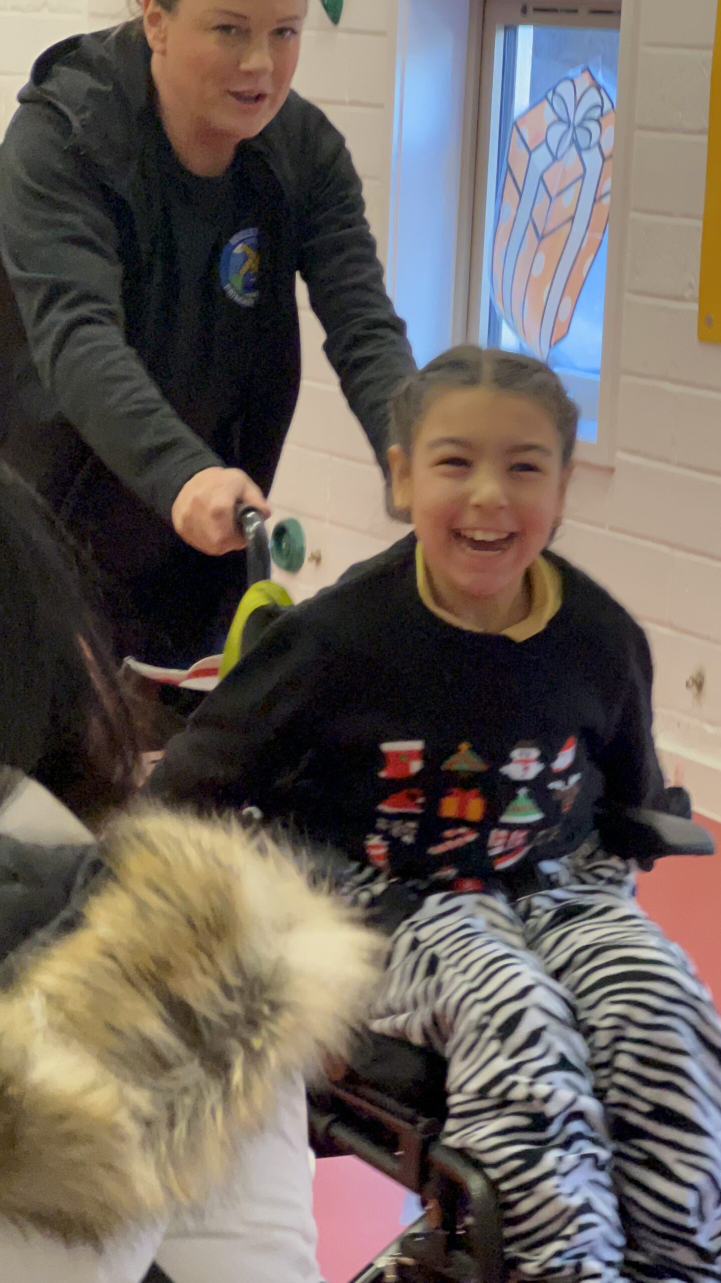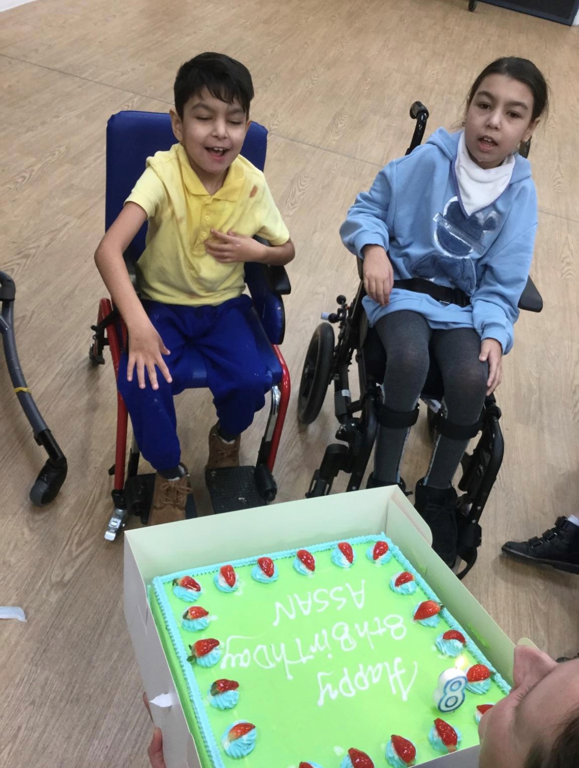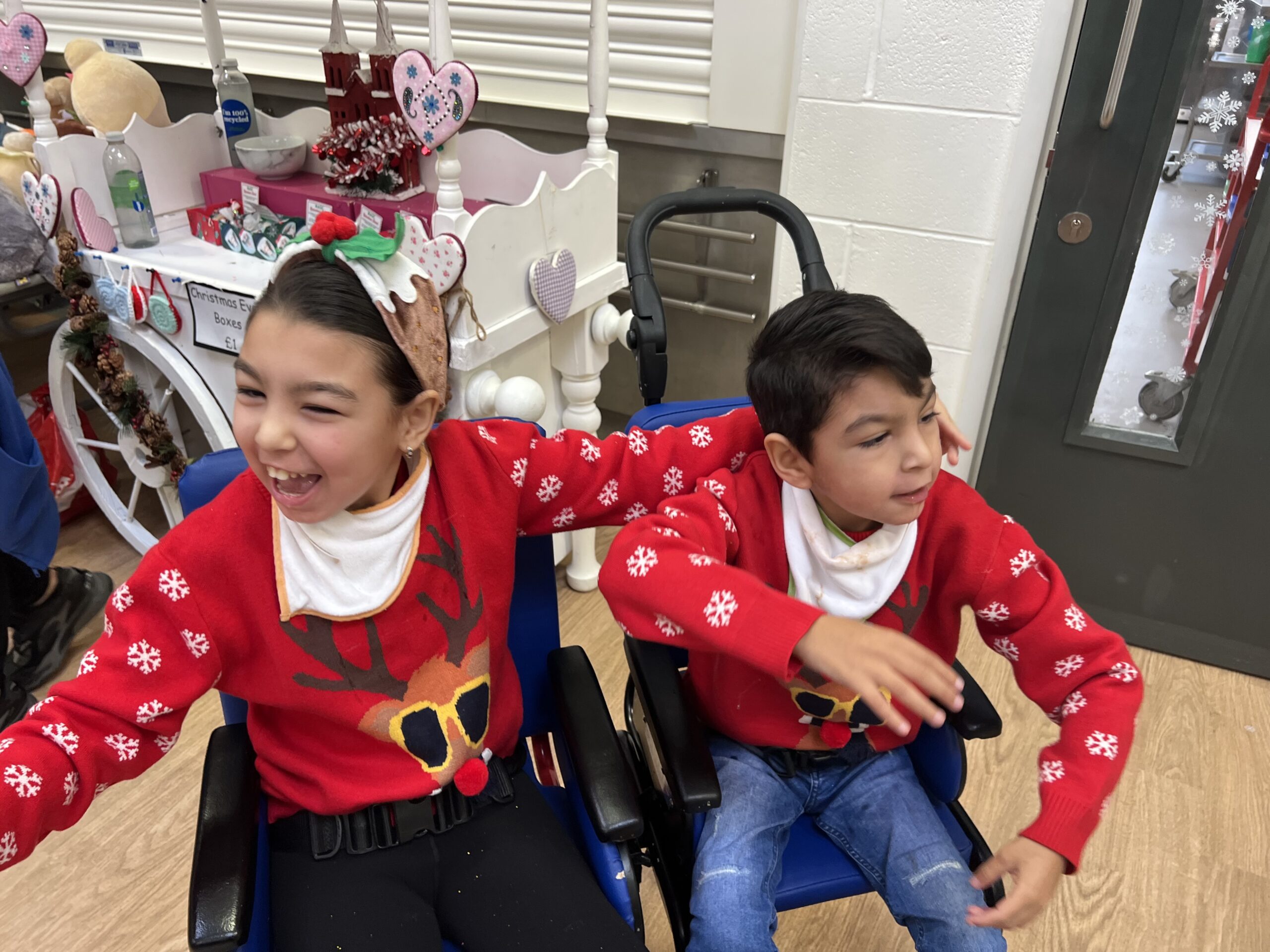 They both bum shuffle on the floor and point to what they want. If they want a drink they will point at their mouth for drink or food. They love snacking most of the time! We always make homemade food for them. The whole family cooks for them – Mom, Dad, Grandad, and Nan. Neither of them can chew properly and cannot eat on their own, but they can pick up crisps and eat snacks.